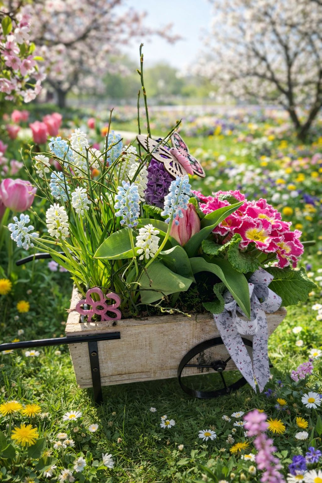 Romantisches Arrangement in Rosé- und Apricottönen, kunstvoll in einer blütenförmigen Vase arrangiert – verspielt, elegant und voller Frühlingsgefühl.